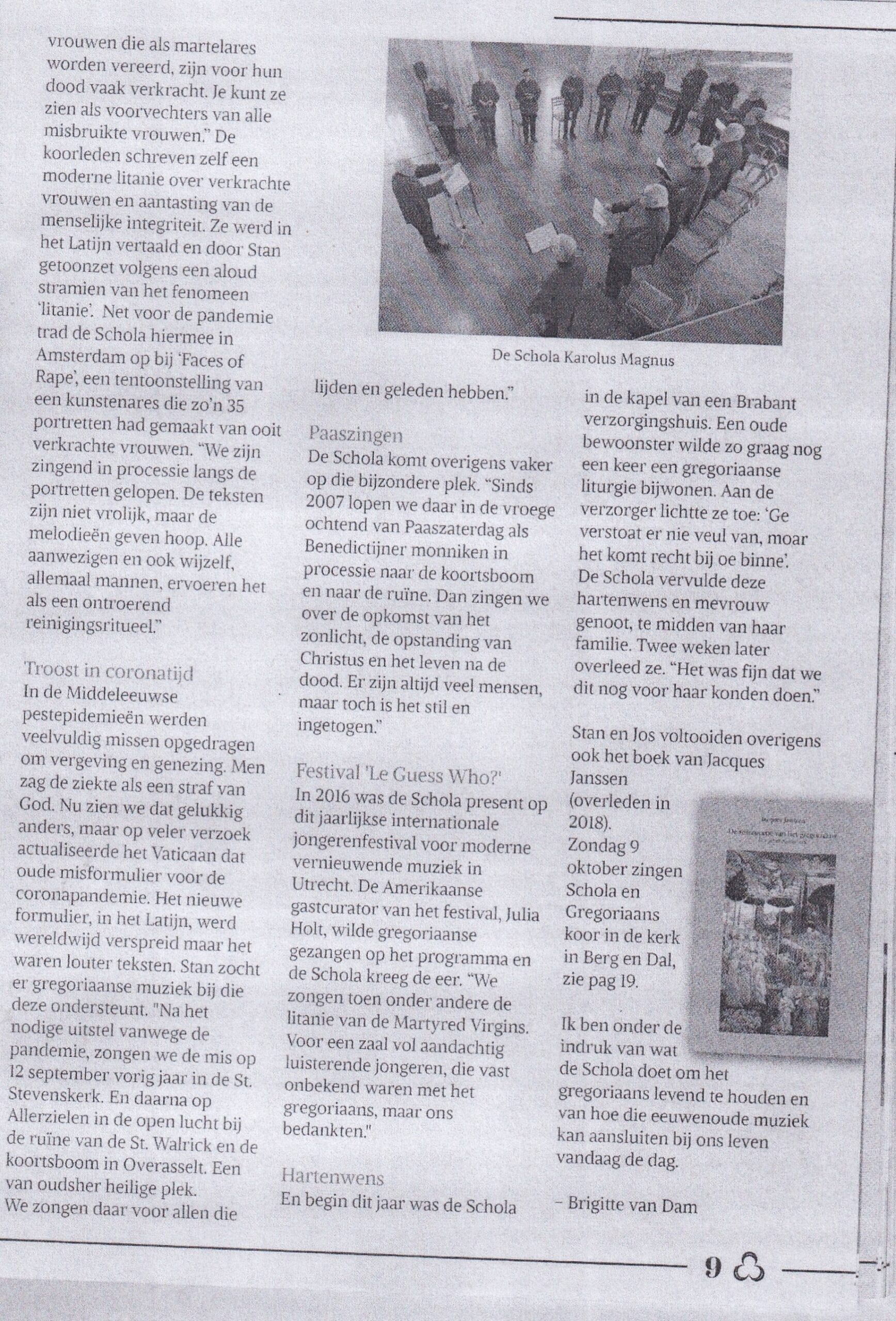 Zondag 9 oktober zingen Schola en Gregoriaans koor in de kerk in Berg en Dal, zie pag 19. Ik ben onder de indruk van wat de Schola doet om het gregoriaans levend te houden en van hoe die eeuwenoude muziek kan aansluiten bij ons leven vandaag de dag.
